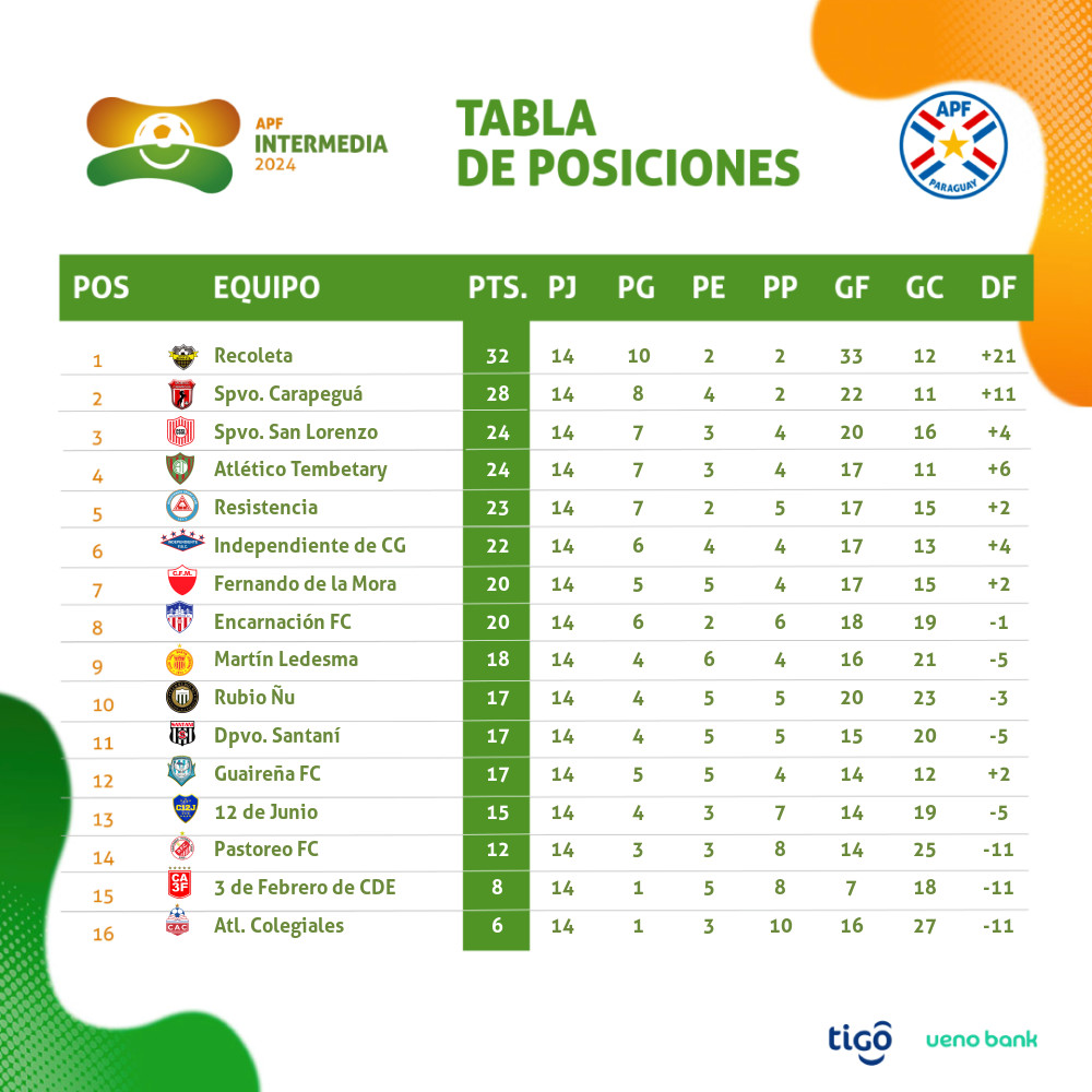 Tercero se ubicó San Lorenzo, que con su victoria 1 a 0 ante el 3 de febrero de Ciudad del Este, trepó a 24 puntos, en la línea de Tembetary.