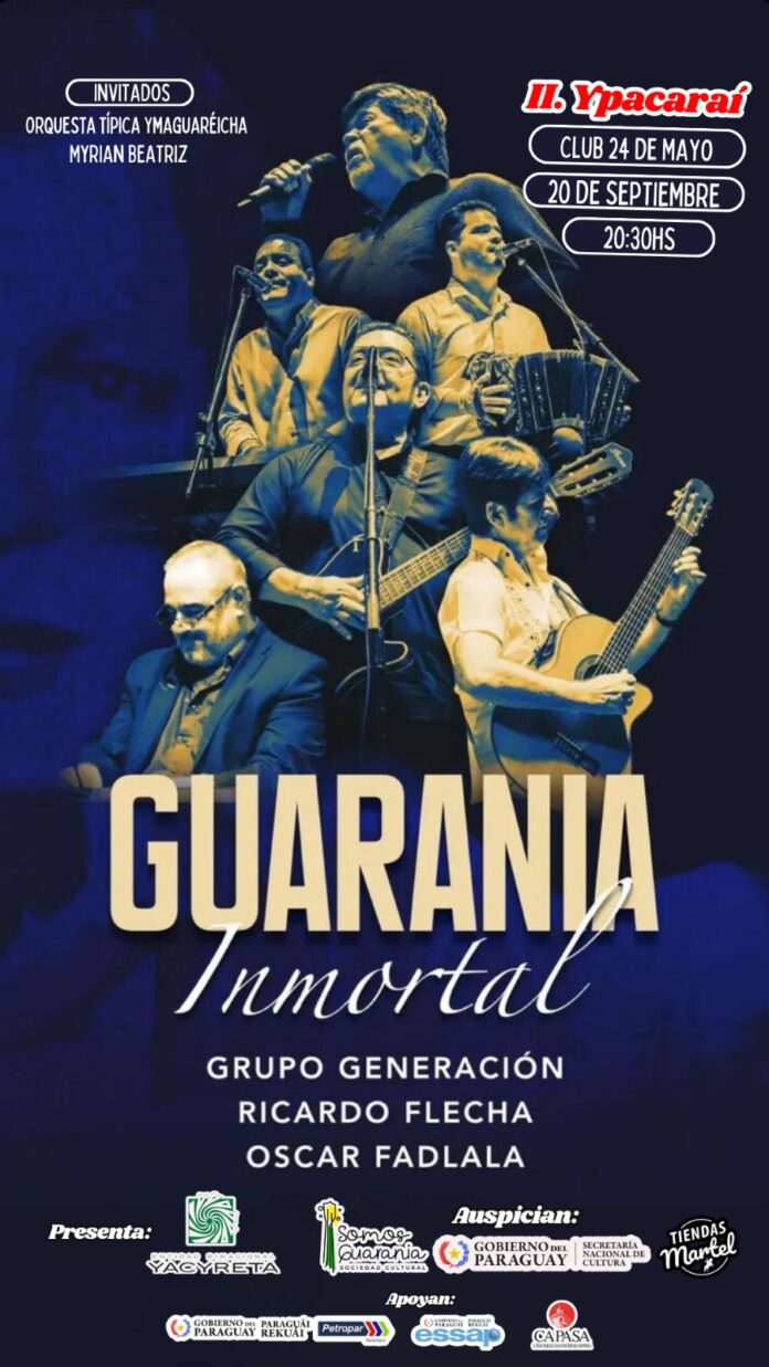El viernes 20 de septiembre se tendrá una edición de “Guarania Inmortal” en el “Club 24 de Mayo” de Ypacaraí, departamento Central. La entrada es libre y gratuita. El proyecto “Guarania Inmortal” es presentada por la Entidad Binacional Yacyreta, y auspiciado por la Sociedad Cultural Somos Guarania @somosguarania. Cuenta con el apoyo de la Secretaria Nacional de Cultura del Paraguay @cultura_py, Petropar, ESSAP, CAPASA, Club 24 de Mayo de Ypacaraí y Tiendas Martel @tiendasmartelpy