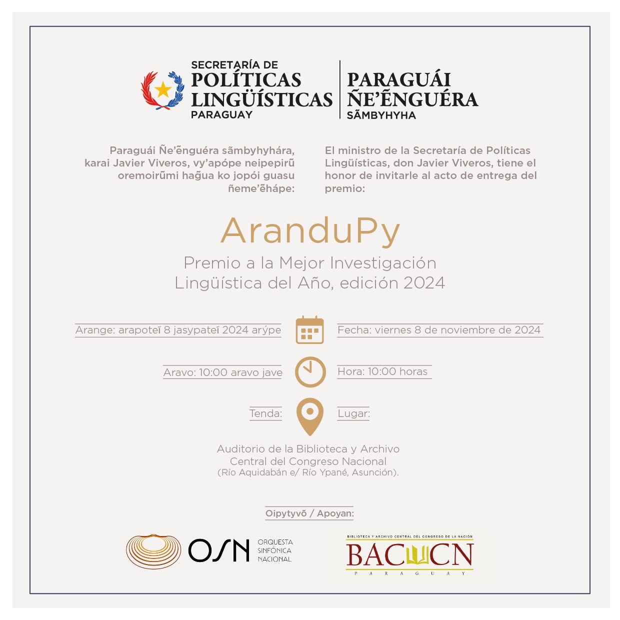 Asunción, Agencia IP.- En coincidencia con el Día del Investigador Paraguayo, la Secretaría de Políticas Lingüísticas (SPL) hará entrega por primera vez este viernes 8 de noviembre del galardón AranduPy – Premio a la Mejor Investigación Lingüística del Año, edición 2024. El evento de premiación será en el Salón Auditorio de la Biblioteca y Archivo Central del Congreso Nacional, a partir de las 10:00 de la mañana.