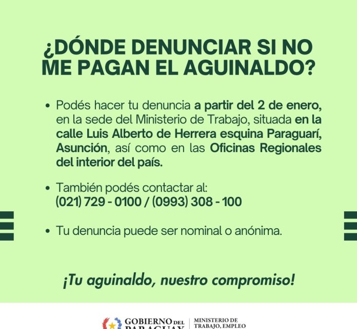Las denuncias por falta de pago del aguinaldo se recibirán en el Ministerio a partir del 2 de enero, en su sede central de Herrera y Paraguarí, de Asunción, o en todas las Oficinas Regionales de Trabajo, de lunes a viernes, de 07:00 a 15:00 horas. También se puede llamar al teléfono (021) 729-0100 o escribir al WhatsApp (0993) 308- 100. Las denuncias pueden ser nominales o anónimas Y los servicios son completamente gratuitos.