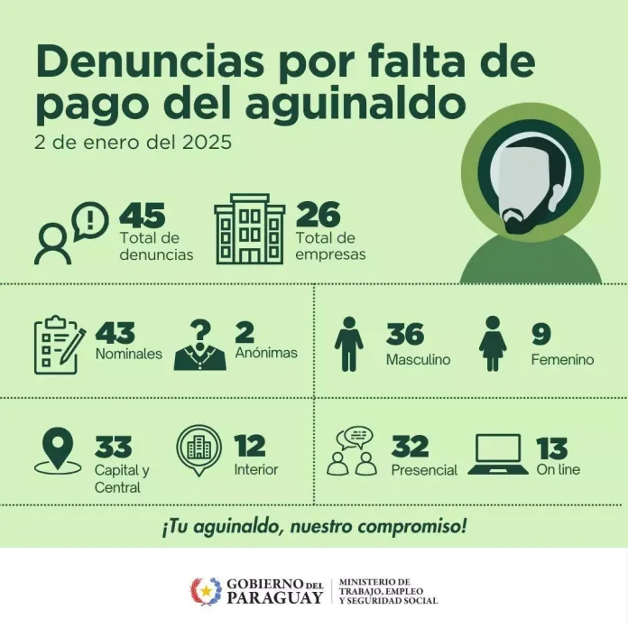 Asunción, Agencia IP.- Los 45 casos por falta de pago del aguinaldo fueron presentados ante el Ministerio de Trabajo, Empleo y Seguridad Social, en el primer día de recepción, en el plazo estipulado por el Código Laboral.