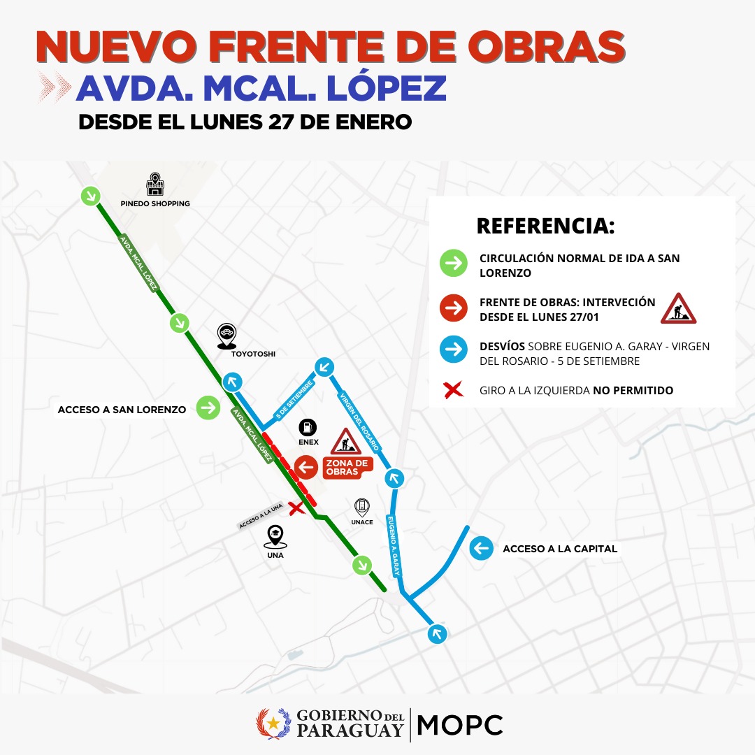 Asunción, Agencia IP.- El Ministerio de Obras Públicas y Comunicaciones (MOPC) informa que, a partir del lunes 27 de enero, se iniciará un nuevo frente de obras en la avenida Mariscal López, específicamente en el tramo comprendido entre el acceso a la Universidad Nacional de Asunción (UNA) y la calle 5 de Setiembre, en dirección hacia Asunción.