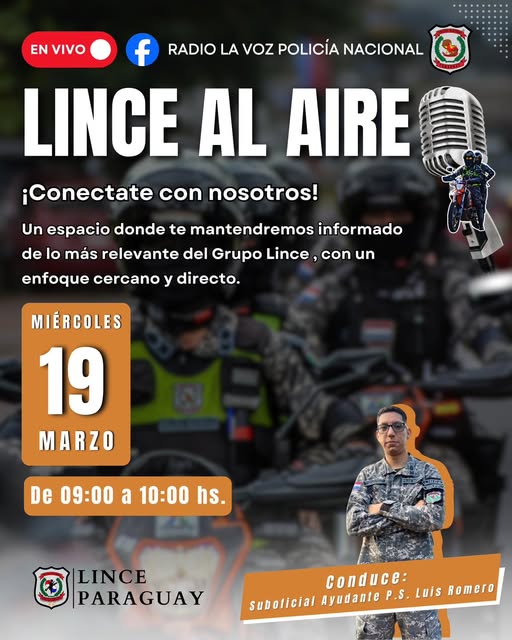 Asunción, Agencia IP.- La radio online «La Voz de la Policía Nacional» estrena este miércoles 19 de marzo su nuevo espacio «Lince al Aire», que permitirá conocer de cerca la labor de la agrupación y generar un espacio de comunicación e interacción con la ciudadanía.