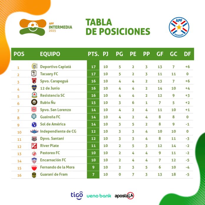 Capiatá y Tacuary lideran el certamen con 17 puntos, seguidos por Carapeguá, 12 de junio y Resistencia con 16 y luego Rubio Ñu con 15.