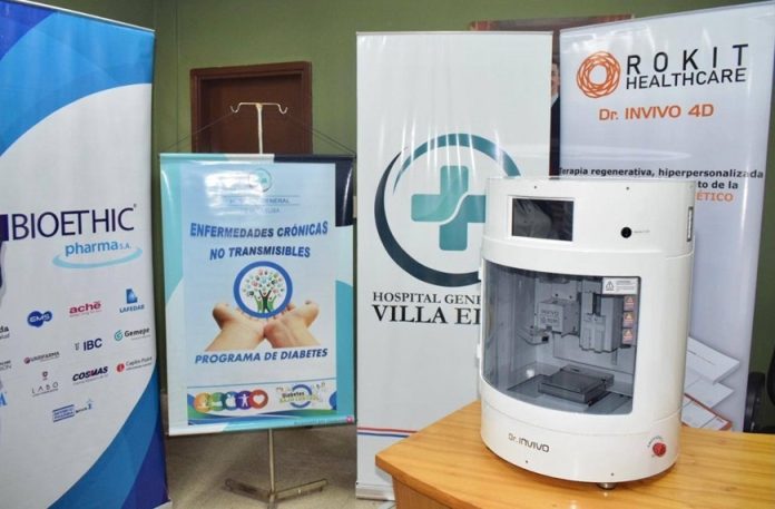 Asunción, Agencia IP.- Un avanzado equipo de tecnología Rokit, adquirido por el Ministerio de Salud recibió el Hospital General de Villa Elisa, que permitirá tratar a pacientes con úlceras crónicas, especialmente aquellos con lesión de pie diabético, mediante un parche autólogo por impresión 3D que acelera la cicatrización y cierre de la úlcera en un 50 por ciento menos del tiempo esperado.