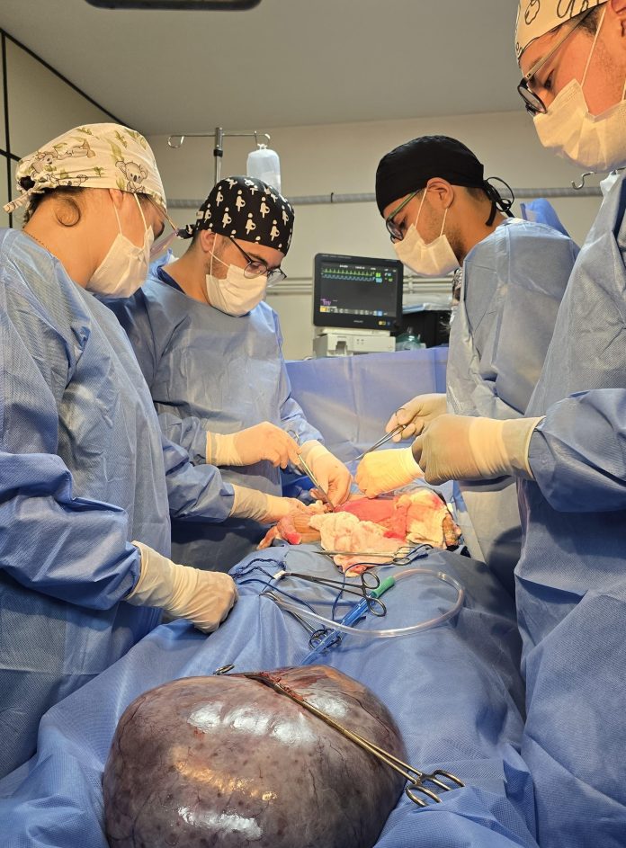 En días previos a la cirugía, la paciente presentó dolor abdominal intenso y persistente, sin respuesta a la analgesia, que motivó la decisión de la intervención quirúrgica. Durante la operación, se encontró un quiste de 7 kilos 800 gramos y cerca de 50 cm de diámetro, que fue retirado por completo junto con el ovario afectado. También se realizó un lavado citológico para asegurar la limpieza de la cavidad abdominal.