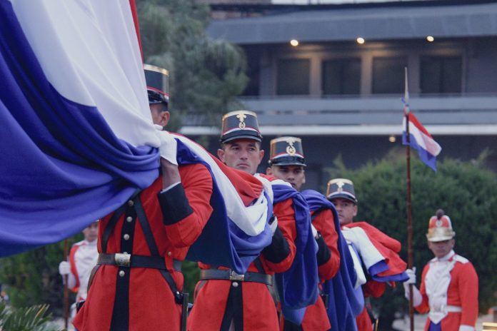 El izamiento de la bandera y la entonación del himno estuvieron encabezados por el Cuerpo de Cadetes de la Academia Militar “Francisco Solano López”, la Gran Banda Militar y el Regimiento de Caballería N° 4 «Aca Carayá».
