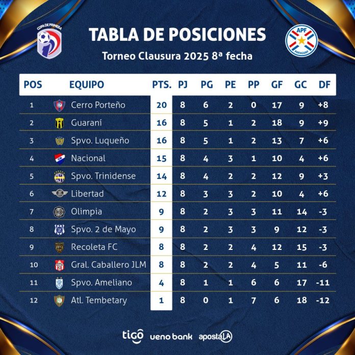 Asunción, Agencia IP.- Se completó la disputa de la fecha numero 8 del campeonato Clausura de la Asociación Paraguaya de Fútbol (APF).
