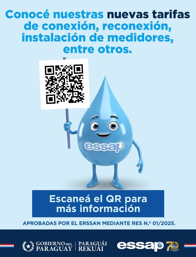 Asunción, Agencia IP.- La Empresa de Servicios Sanitarios del Paraguay S.A. comunica a la ciudadanía que por resolución N.º 01 del Ente Regulador de Servicios Sanitarios (Erssan) del 15 de setiembre de 2025, se aprobó la actualización de las tarifas correspondientes a prestaciones y servicios vinculados a la provisión de agua potable y alcantarillado sanitario, a partir del próximo 6 de octubre.