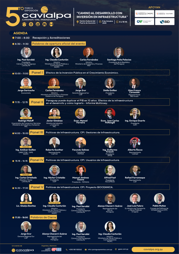 En la tarde, el tercer y cuarto panel se centrarán en las políticas de infraestructura, con la participación de gestores y organizaciones de usuarios de la infraestructura vial. Finalmente, el quinto panel abordará el proyecto Bioceánica, considerado clave para la integración regional y el desarrollo logístico del país.cia.com.py