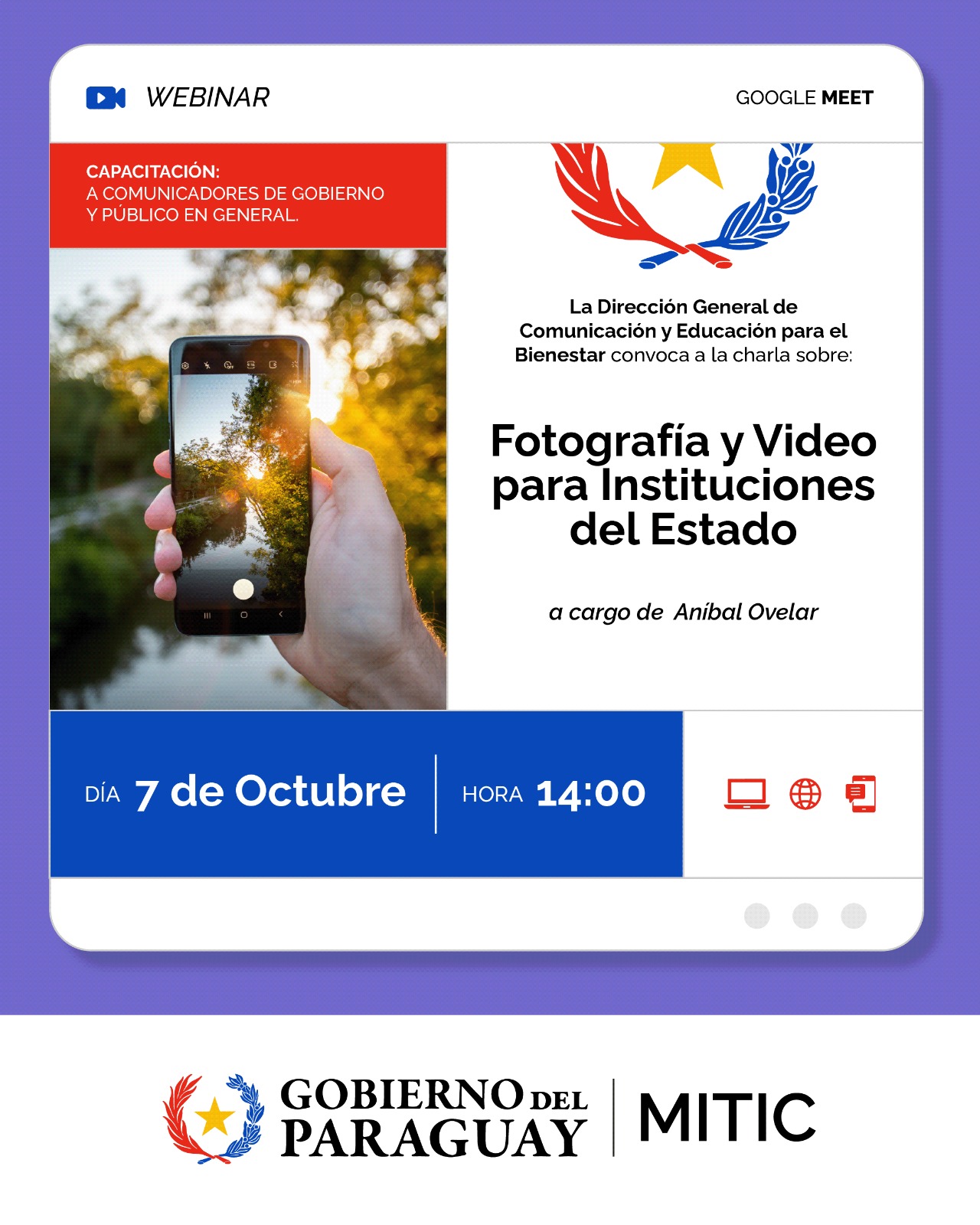 Asunción, Agencia IP.-  El Ministerio de Tecnologías de la Información y Comunicación (Mitic) extiende una invitación a los profesionales del sector y a los funcionarios públicos para que se unan al próximo Ciclo de Capacitación, cuyo objetivo es utilizar estratégicamente fotografía y video en las instituciones estatales.