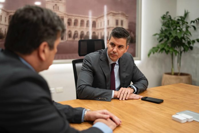 Asunción, Agencia IP.- El presidente de la República, Santiago Peña recibió en audiencia al ministro de Industria y Comercio, Javier Giménez para conversar sobre Paraguay 2X, un programa inédito que impulsa más de 500 acciones para duplicar las exportaciones y fortalecer la competitividad de la industria nacional.