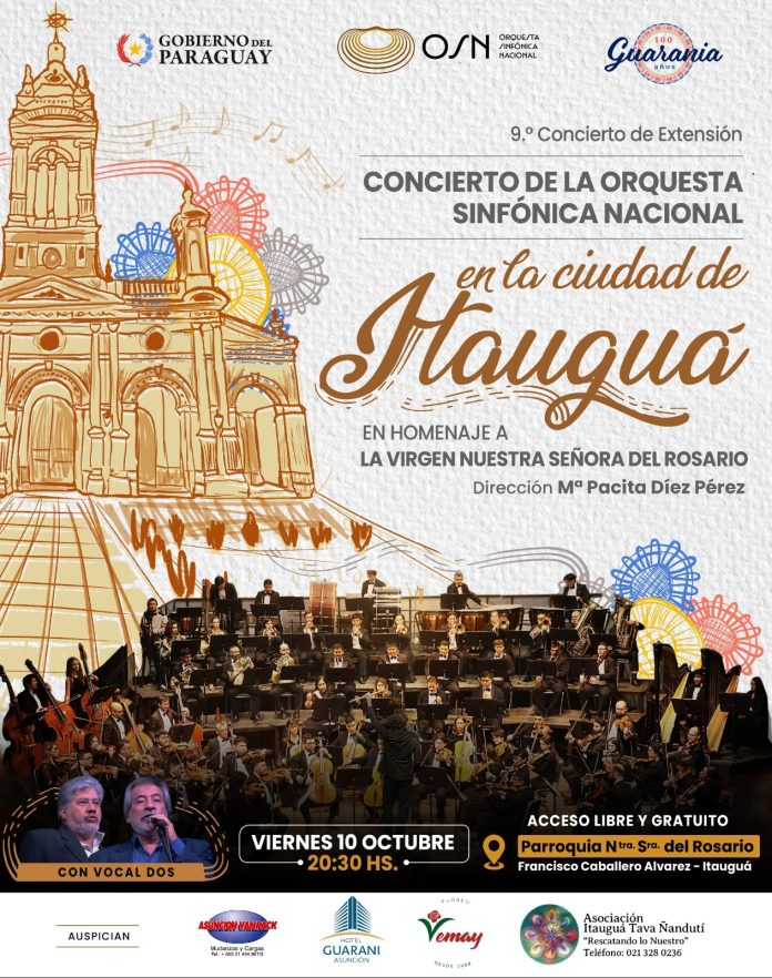 La OSN, conducida por la maestra María de la Paz «Pacita» Diez Pérez, exhibirá un repertorio vibrante que une lo popular con lo clásico, en la Parroquia Nuestra Señora del Rosario (Itauguá – Francisco Caballero Álvarez), este viernes 10 de octubre a las 20:30, con acceso libre y gratuito.