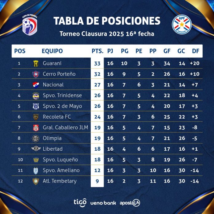 Guarani sigue liderando la clasificación con 33 puntos, Cerro Porteño es el escolta con 32 y Nacional es el tercero con 27 unidades en las principales colocaciones.