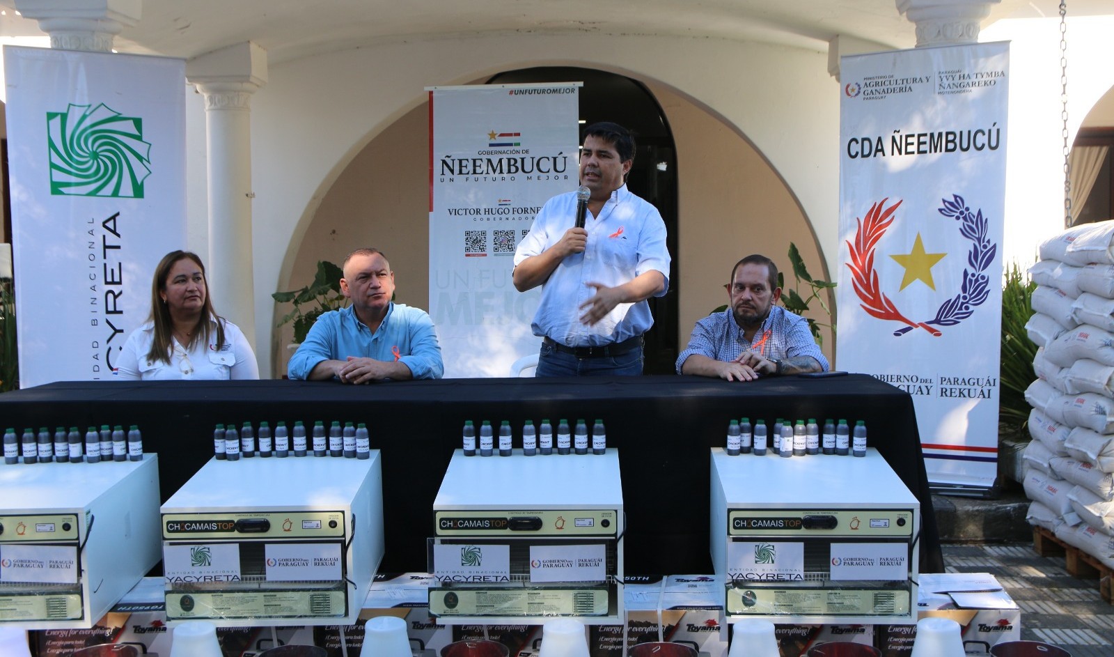 Asunción, Agencia IP.- Comités de productores de Ñeembucú recibieron kits avícolas de la Entidad Binacional Yacyretá este martes, durante un acto realizado en sede de la Gobernación, con la presencia del director ejecutivo paraguayo Luis Benítez Cuevas, autoridades departamentales y representantes de organizaciones beneficiadas. La inversión incluye igualmente cerca de 16 mil pollitos, balanceados, bebederos, comederos, vitaminas y antibióticos.