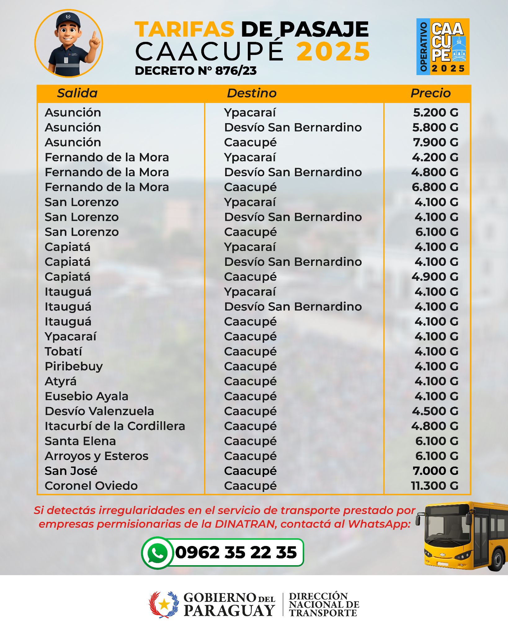 Asunción, Agencia IP.- La Dirección Nacional de Transporte (Dinatran) recuerda que las tarifas de pasaje vigentes para el viaje hasta Caacupé están establecidas en el Decreto N° 876/23.