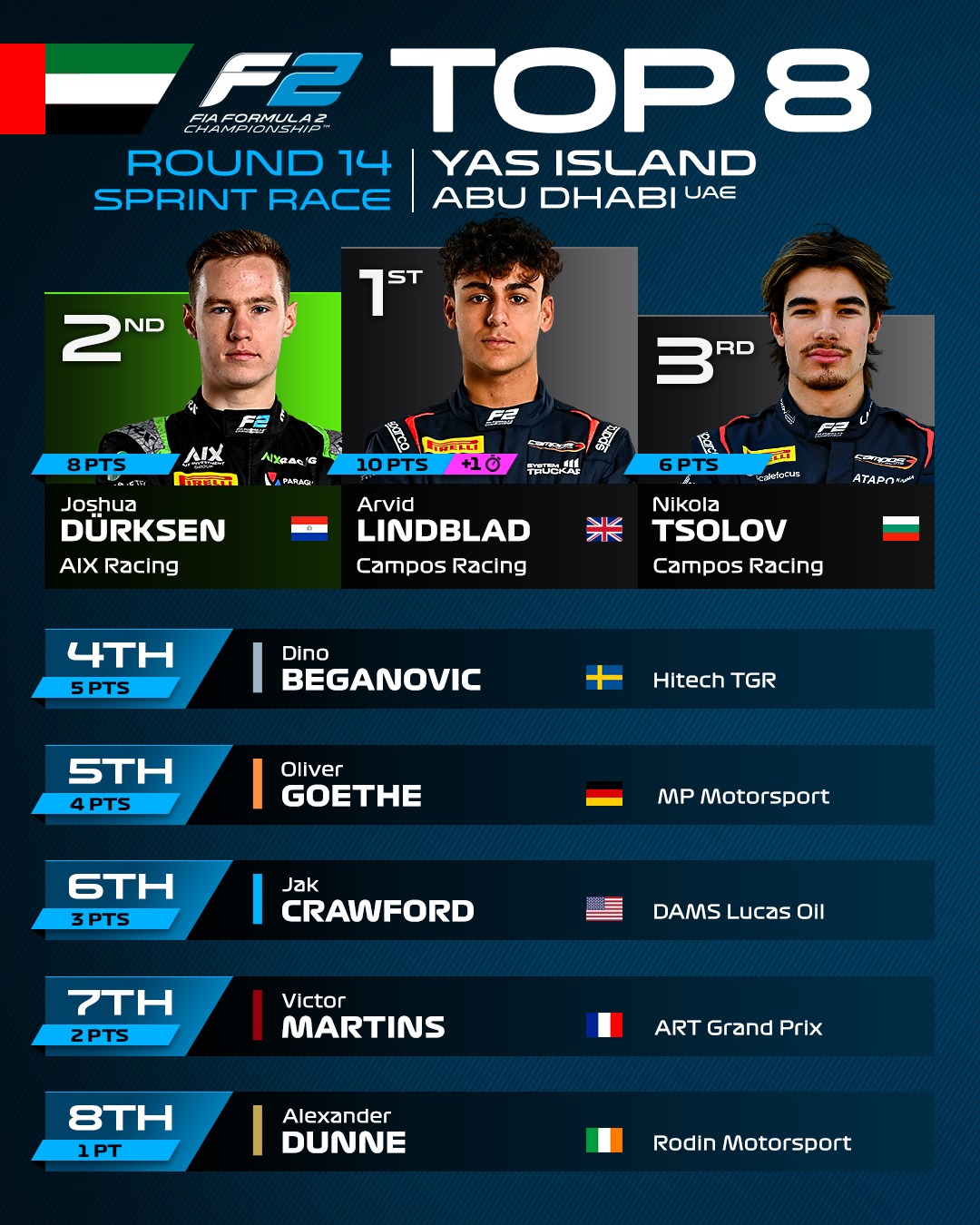 En la carrera disputada en las Islas de Yas, ubicado en Abu Dabi, Emiratos Árabes Unidos, Joshua terminó segundo, a apenas nueve décimas de Arvid Lindblad, el británico que correrá en F1 con Racing Bulls en 2026.