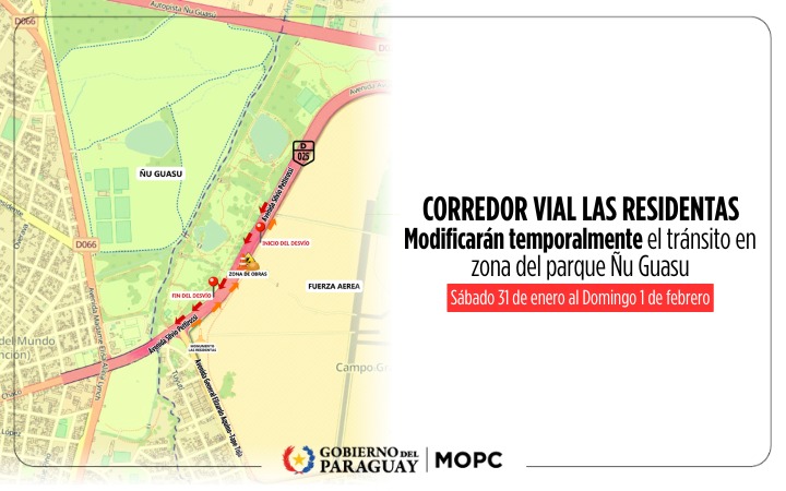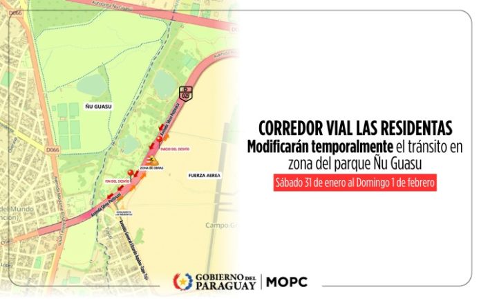 Asunción, Agencia IP.-El Ministerio de Obras Públicas y Comunicaciones, informa que este sábado 31 de enero y domingo 1 de febrero se implementará una modificación temporal del tránsito sobre la autopista Silvio Pettirossi, a la altura del parque Ñu Guasu, en la ciudad de Luque.