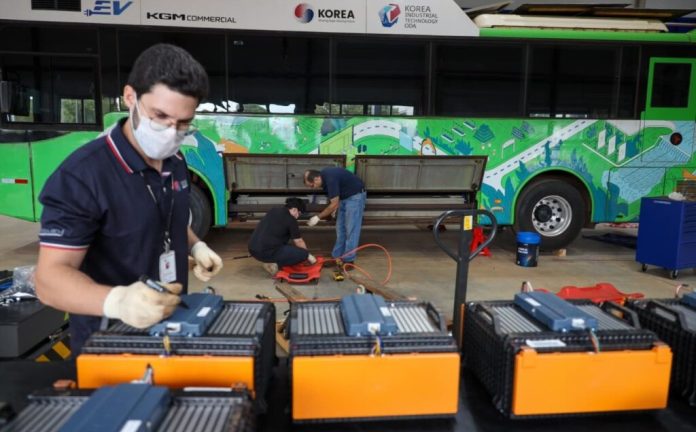 Asunción, Agencia IP.- En el marco del proyecto Centro TASK Paraguay de Autopartes y del Plan Piloto de Movilidad Eléctrica Sostenible, técnicos de Corea del Sur realizan el mantenimiento de los cinco buses eléctricos donados por el país asiático. Los trabajos, que se extenderán durante 3 semanas, incluyen la capacitación del personal de la Entidad Binacional Itaipú en el cuidado y reparación de los vehículos.