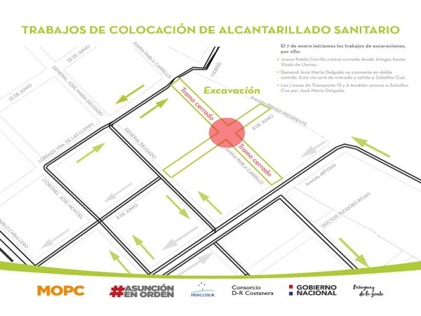 Asunción, Paraguay, Agencia IP.- Desde hoy jueves se realizarán excavaciones en la zona del Corredor Vial Botánico específicamente en el cruce de las calles Juana Pabla Carrillo y 8 de Junio, del barrio Santa Rosa de Asunción. Para ello, se previeron desvíos que servirán para el ingreso y salida a Zeballos Cue.