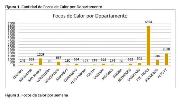 En ese periodo, el departamento de Presidente Hayes fue el más afectado registrando 5.035 focos, entre los municipios más afectados están Villa Hayes (3.635) y Pozo Colorado (2.116), seguido por el departamento de Alto Paraguay con 1.581, siendo los municipios de Fuerte Olimpo (1174) y La Victoria (752) los más afectados y en la Región Oriental el departamento de San Pedro, con 667 focos de calor y los municipios más afectados fueron San Pedro del Ycuamandyyu (166) y Tacuatí (123) y el departamento de Concepción con 407 focos de calor, siendo los municipios de Concepción (362) y San Lázaro (34) los más afectados.