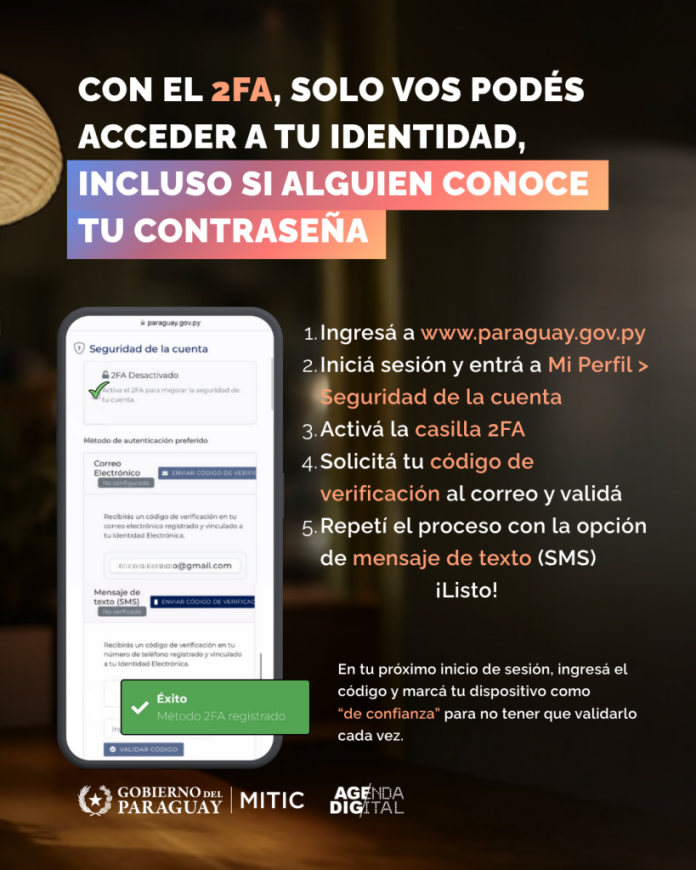 Asunción, Agencia IP.- El Portal Paraguay incorpora una nueva funcionalidad a la Identidad Electrónica: la Autenticación en Dos Factores (A2F), con el objetivo de brindar mayor seguridad y protección a los datos personales de los ciudadanos en los trámites digitales.