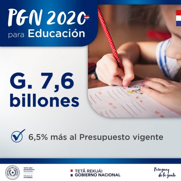 Asunción, IP.- El Gobierno con miras a progresar a una educación de mayor calidad e incluyente, que privilegie la innovación y la equidad, prevé en el proyecto de Presupuesto General de Nación (PGN) 2020 invertir 7,6 billones de guaraníes, superior en 6,5% al presupuesto vigente.